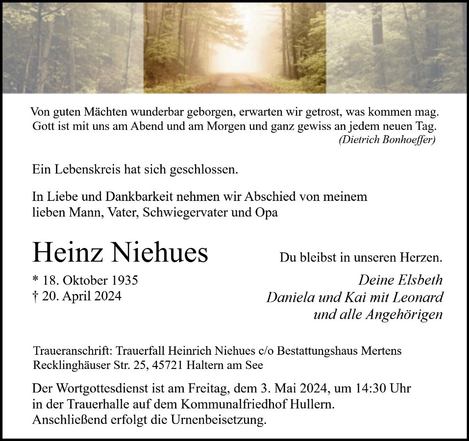 In Gedenken an den Verstorbenen Heinrich Niehues:
