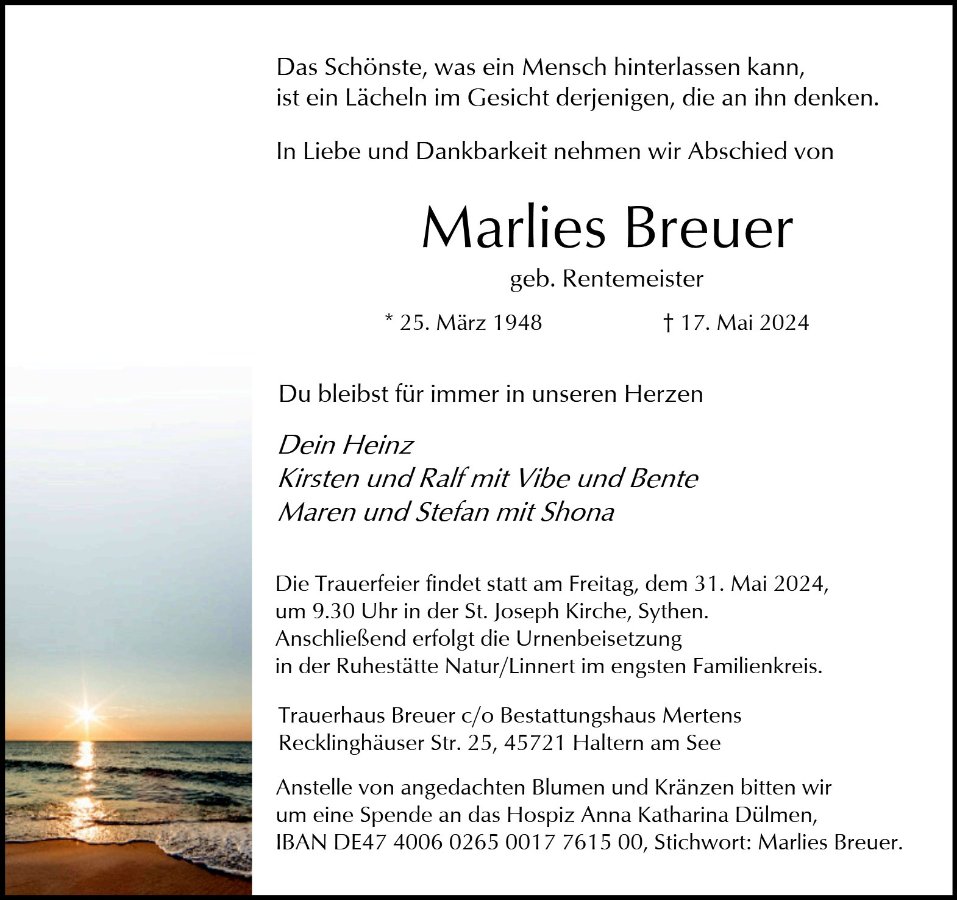 In Gedenken an die Verstorbene Marlies Breuer: