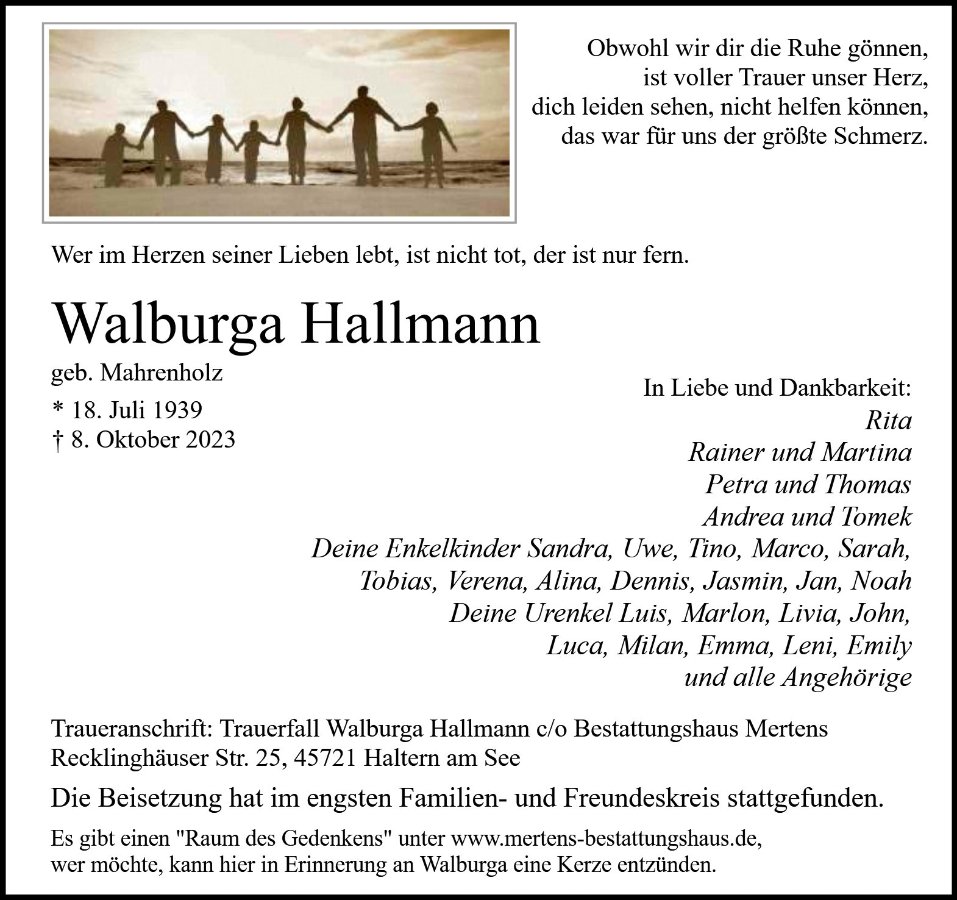 In Gedenken an die Verstorbene Walburga Hallmann.